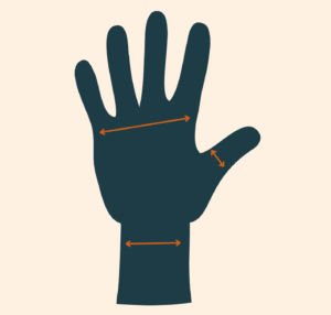 A indiquer dans le formulaire de commande : couleur, largeur du poignet, largeur du pouce, largeur de la main (de la base de l’index à la base de l’auriculaire) et éventuelles décorations